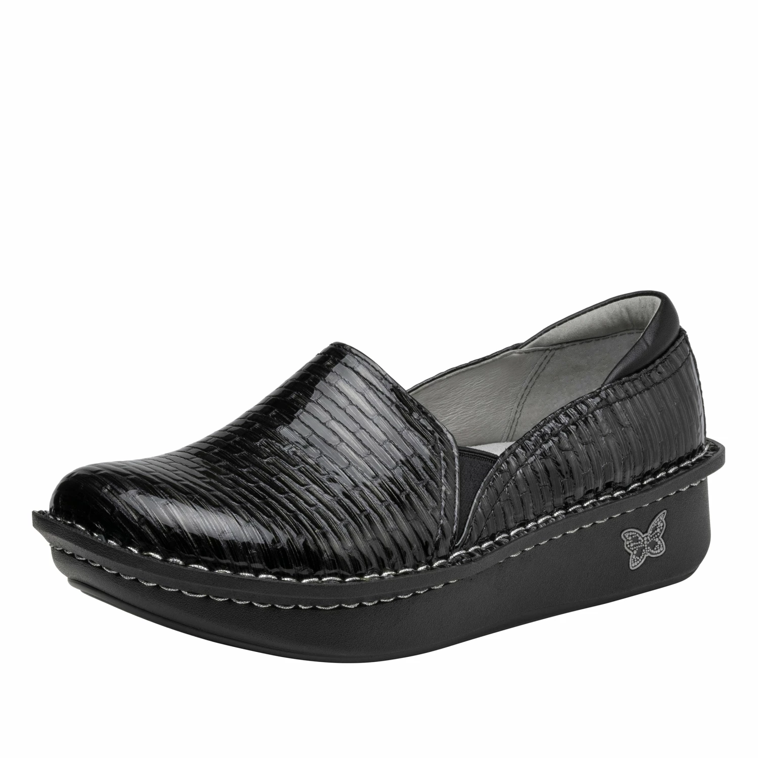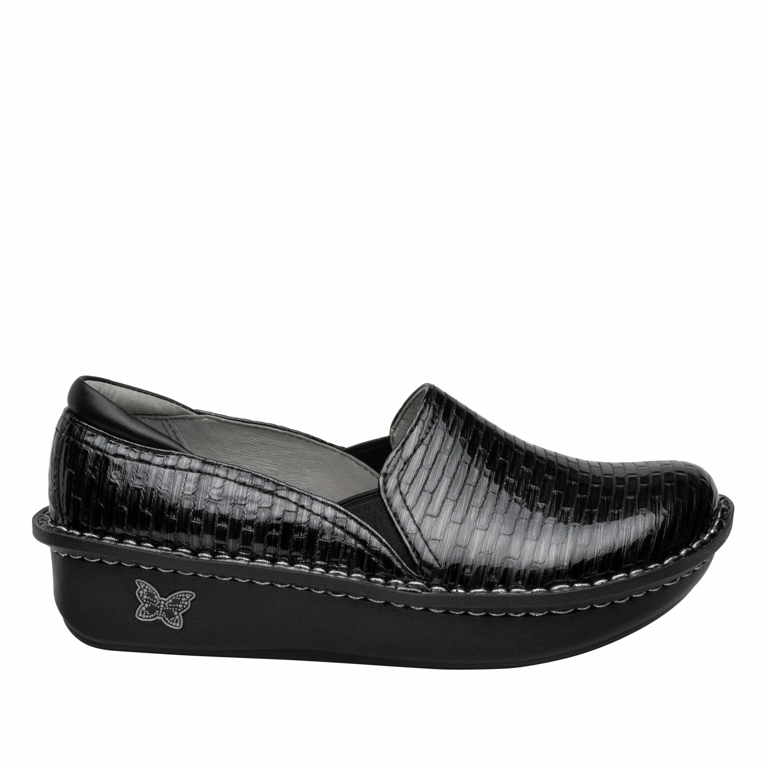 Featured in a fun Brick By Brick embossed design on patent upper.