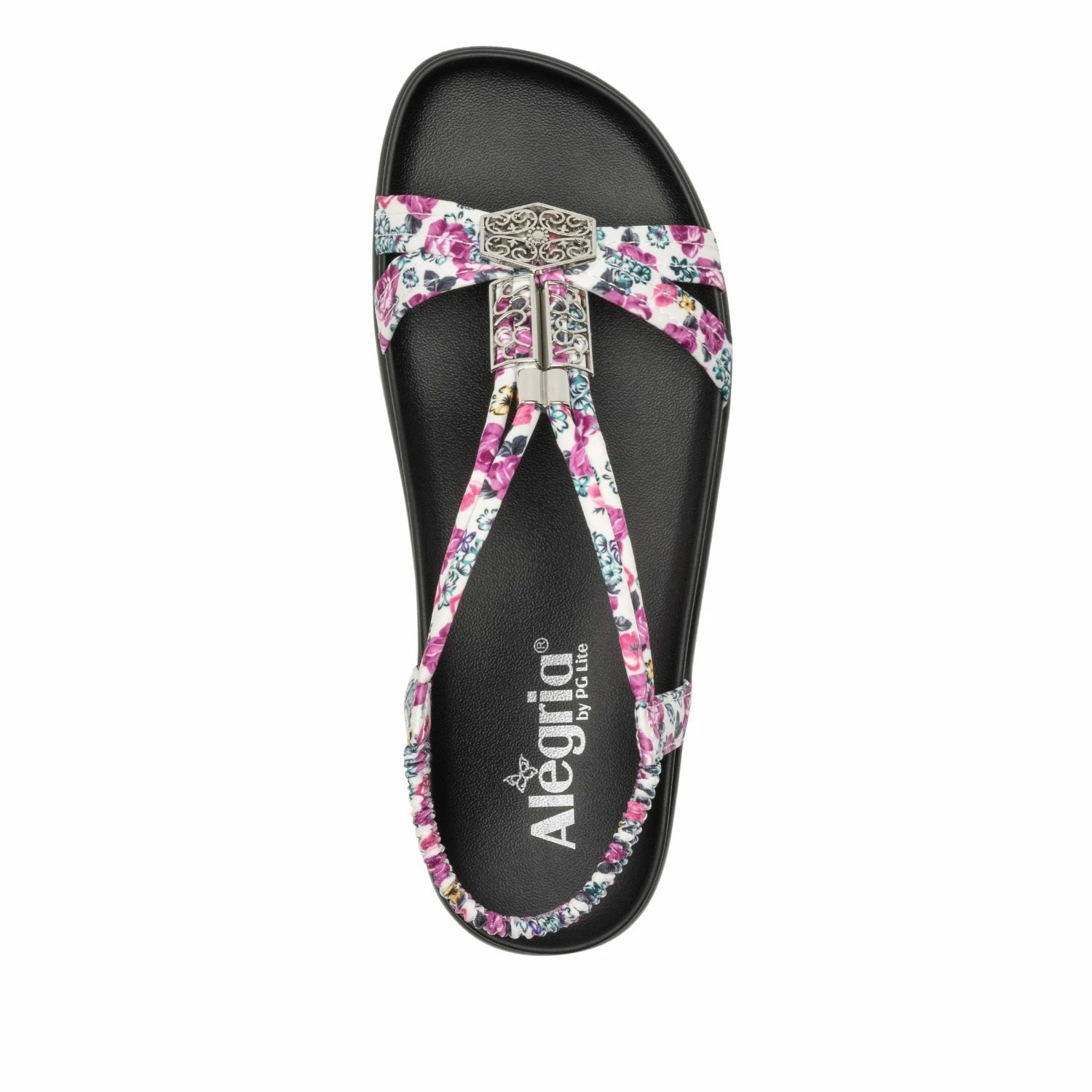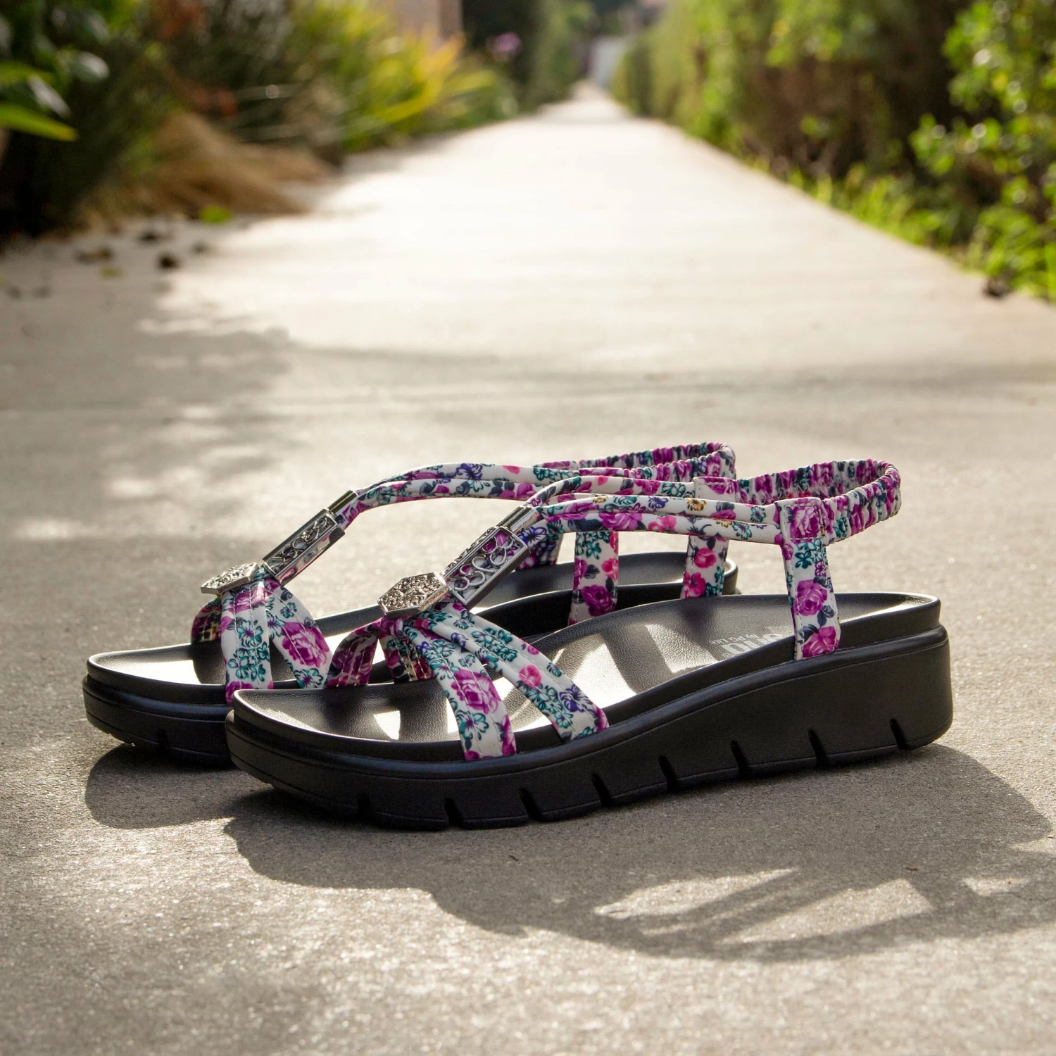 Featured in a floral printed Lovely Fuchsia design on a leather upper, this t-strap sandal has all the chic boho appeal your summer outfits are looking for.