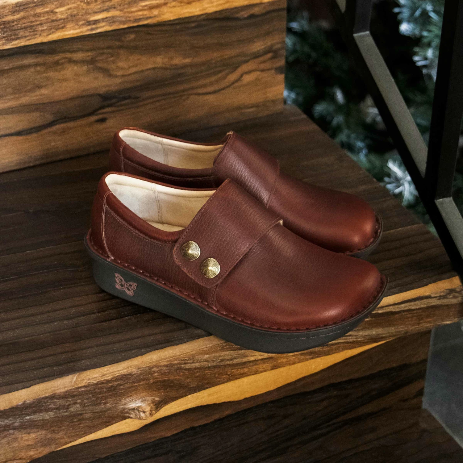 Stay sure footed in this adjustable hook-and-loop strap leather casual shoe dressed up with decorative artisanal hardware. A gently padded collar and ergonomically designed removable footbed made of memory foam and cork enhances its wearability. Underneath it all is a slip-resistant classic rocker outsole for nine-to-five comfort.