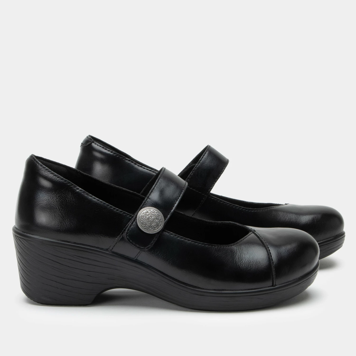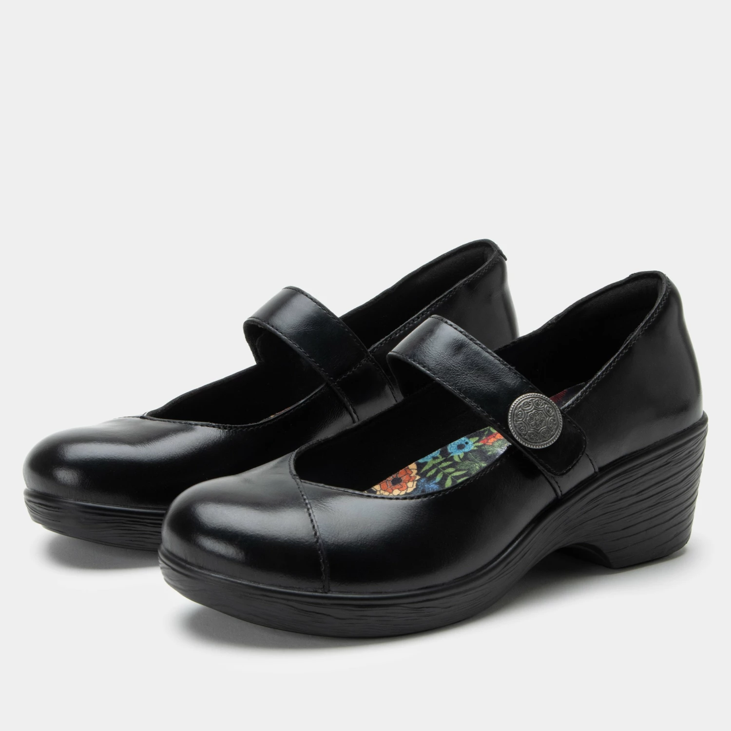 Mary Janes have matured in this grown-up leather version featuring a featherweight slip-resistant wood-look wedge bottom. Dressing it up is an adjustable hook-and-loop close strap with a decorative metal ornament. A printed microsuede-lined footbed made of polyurethane, cork and memory foam completes the ladylike story.