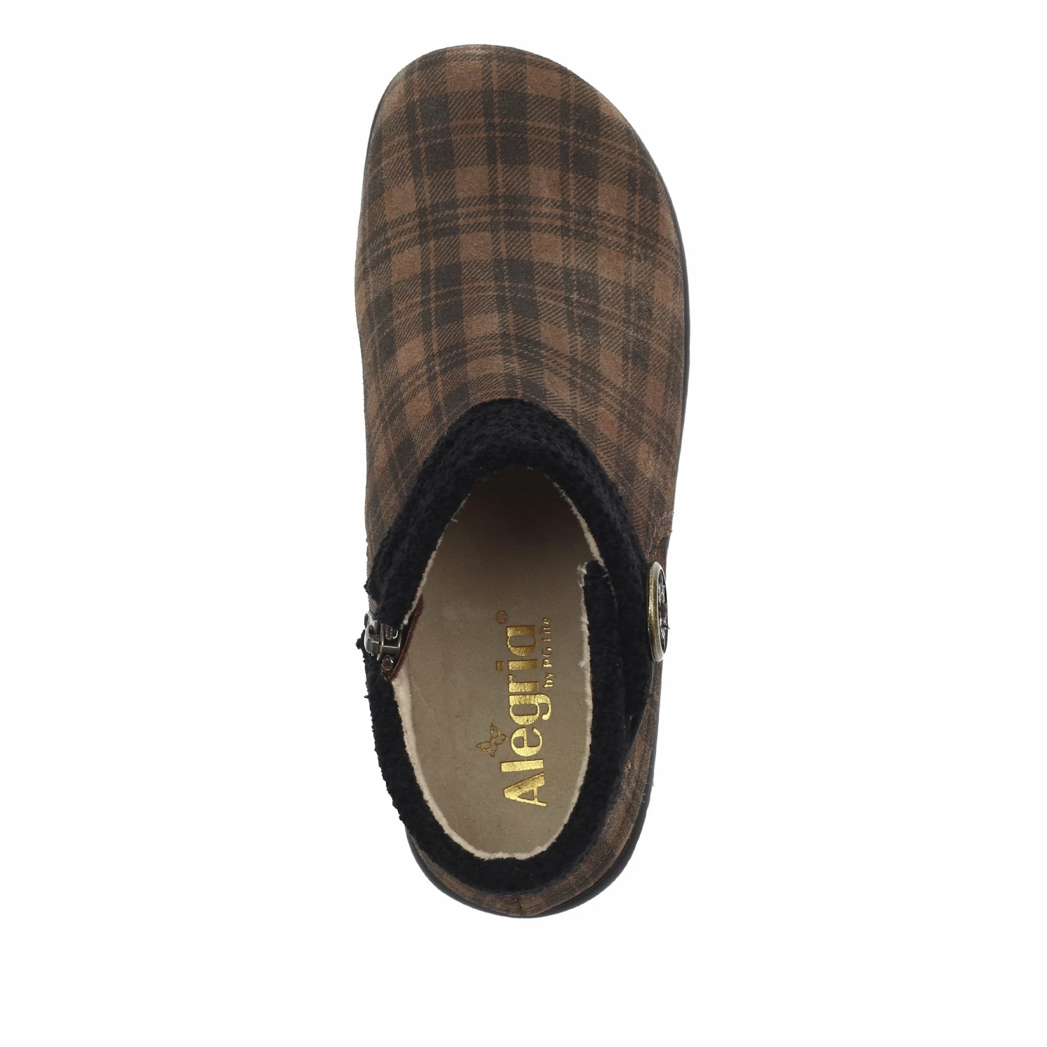 Ankle bootie featuring a timeless Kickin It plaid pattern on suede leather with a cozy knit collar adorned with a unique decorative button. An inside zipper helps putting it on with ease, for a comfy style perfect for the transitioning seasons.