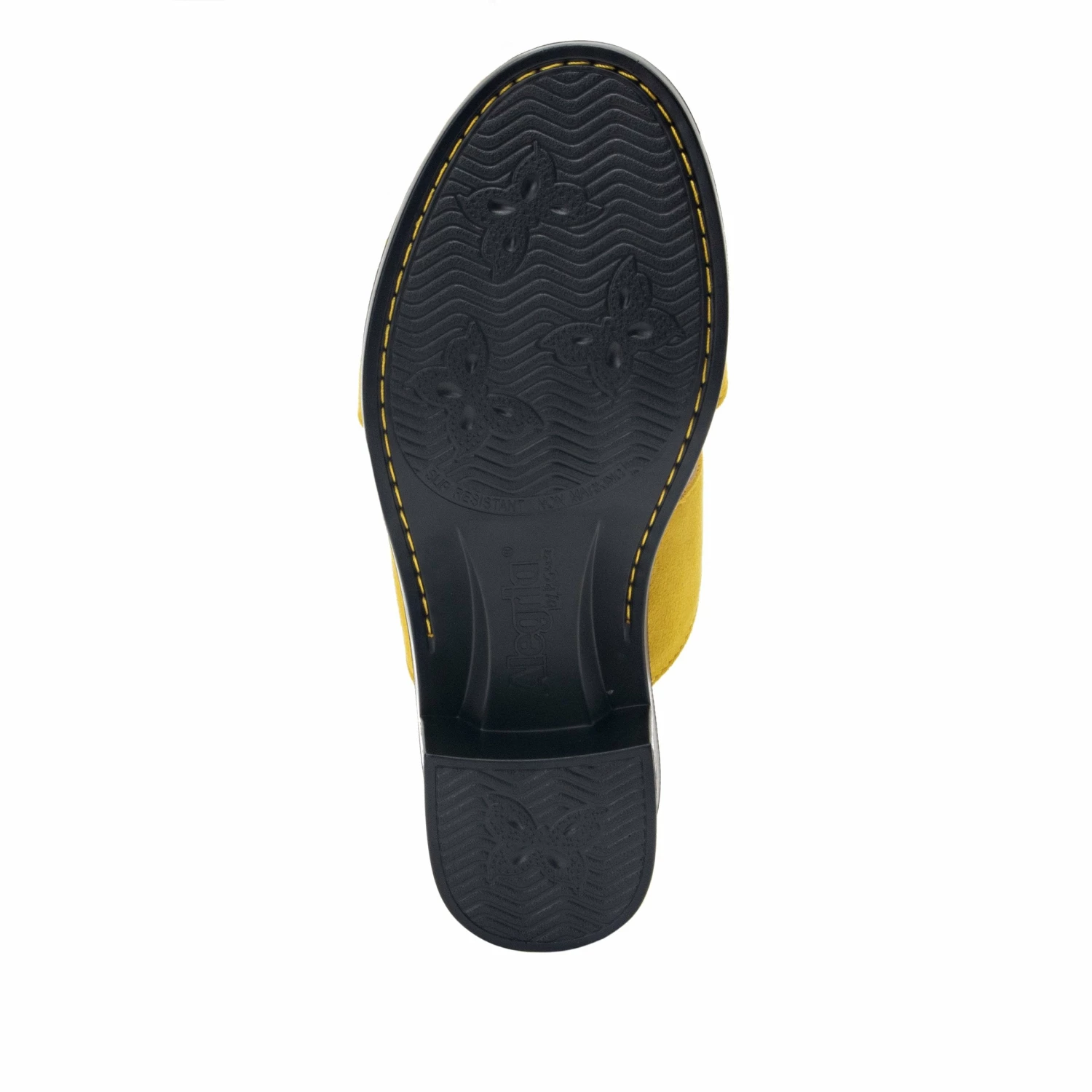 Featured in a richly colored Saffron microsuede upper with matching microsuede footbed, detailed with a contrast topstitch.